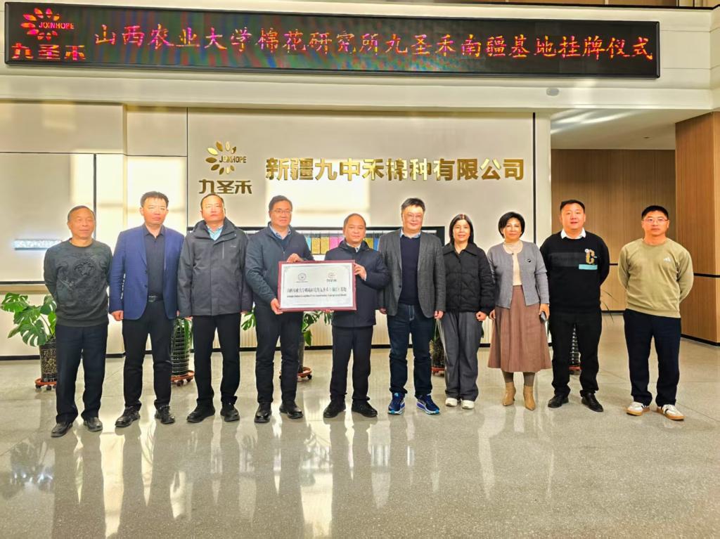 新疆九中禾棉种有限公司是九圣禾控股集团有限公司的子公司,长期扎根新疆、服务全国,在棉种“育繁推一体化”布局中优势显著,其新建的棉种科技产业园已成为新疆棉区创新核心平台。此次挂牌,有利于发挥我所在抗虫、耐除草剂转基因棉花育种、种质资源创新等方面的技术优势,进一步拓展了我所在南疆的棉花研究基地。共建的试验基地将聚焦南疆棉区生产痛点,重点开展三大核心工作:一是联合推进新型抗虫、耐除草剂转基因棉花转化体创制及新品种选育,破解当地棉花品质不均、抗逆性不足等产业瓶颈;二是搭建“实验室到田间”的成果转化桥梁,将山西农大的科研成果与九圣禾的产业化优势相结合,加速优良品种示范推广;三是建立产学研协同育人平台,为南疆培养棉花种植技术骨干和科研人才。基地建成后,预计将辐射带动周边棉区优良品种覆盖率提升,助力实现单位面积产量提高、农药化肥使用强度降低的绿色发展目标。