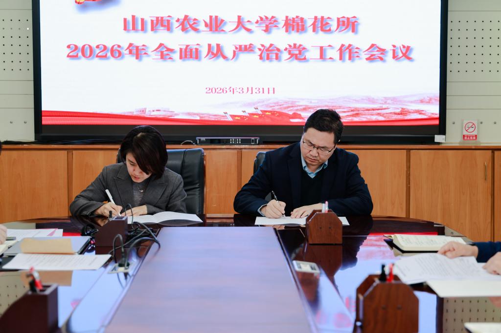 会上,领导班子成员与各党支部书记、各科室负责人现场签署了《落实全面从严治党、党风廉政建设和反腐败斗争责任书》;所纪委书记、副所长梁哲军同志对中层干部进行集体廉政谈话,要求严守纪律红线、坚守廉洁底线,为棉花科研事业高质量发展提供坚强保障。(图片来源:党政办)