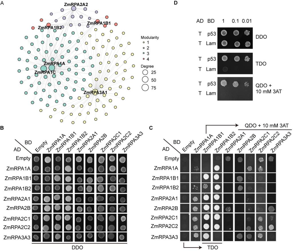 本研究在玉米中鉴定到13个ZmRPA成员,其蛋白质长度差异较大,介于86至876个氨基酸之间。系统发育分析表明ZmRPA分为三个不同的亚组:RPA1、RPA2和RPA3。值得注意的是,在每个亚组内部,ZmRPA蛋白的基序相似,但在不同亚家族间存在差异。基因重复事件分析表明,RPA基因在玉米中保持高度保守。此外,顺式作用元件分析显示RPA基因与光响应以及植物生长发育相关。RNA-seq分析揭示,部分ZmRPA基因在冷和干旱胁迫下表现出明显的表达变化;组织特异性表达分析结果表明,大多数ZmRPA基因在活跃分裂的分生组织和生殖原基中高表达。蛋白互作分析和酵母双杂交实验证实,ZmRPA家族成员彼此相互作用以执行其生物学功能。这些发现表明ZmRPA家族亚基可能通过蛋白相互作用形成不同类型的异源复合体,从而在植物生长发育以及胁迫响应中发挥重要作用。本研究为玉米RPA家族基因后续的功能验证和分子育种应用提供了宝贵的基因资源。