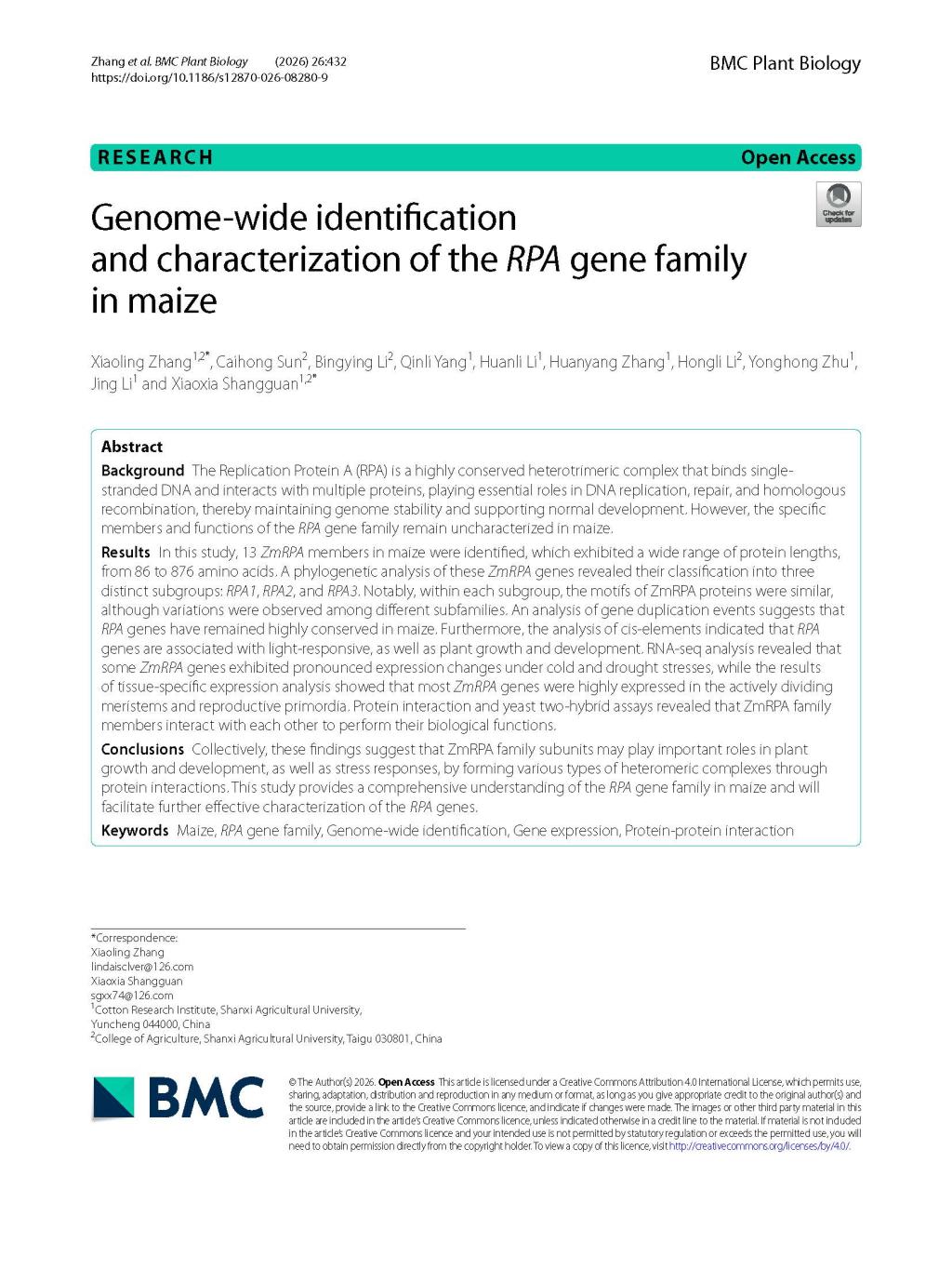 近日,山西农业大学棉花研究所科研人员完成了玉米(Zea maysL.)RPA基因家族的全基因组鉴定及基本特征分析,相关研究成果以“Genome-wide identification and characterization of theRPAgene family in maize”为题发表在《BMC Plant Biology》(IF=4.8,生物学2区Top期刊)。该论文系统揭示了玉米RPA基因家族特征,为阐明该家族成员通过蛋白互作形成多样化复合体,进而调控植物生长发育及逆境响应的分子机制奠定了基础。