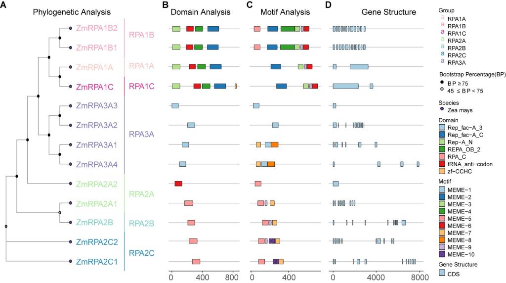 复制蛋白A(RPA)是高度保守的异源三聚体复合物,能够结合单链DNA并与多种蛋白质相互作用,在DNA复制、修复和同源重组中发挥重要作用,从而维持基因组稳定性以及生物的正常发育。然而,玉米中RPA基因家族的具体成员和功能尚未见报道。